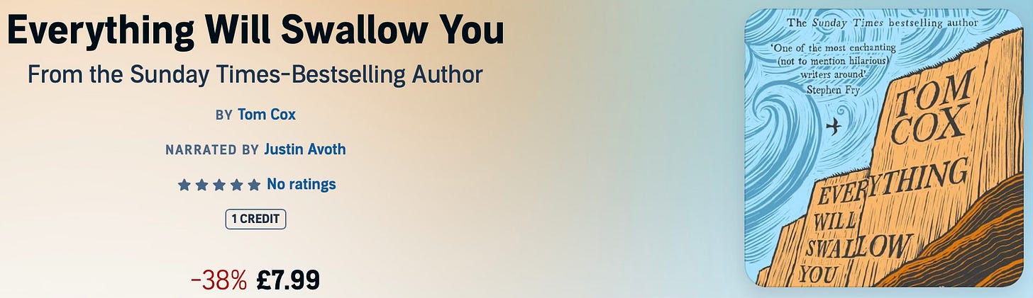 I’m sorry if this is the second email you’ve received from me this afternoon and I don’t intend to make a habit of doing this, but since today is quite an important day, on which the audiobook of Everything Will Swallow You is released, I wanted to make sure everyone knew about that. I also want to alert new subscribers (and longer term ones who didn’t realise) that the place to sign up to my newsletter is now here at my very own website, NOT on Substack. If you want to upgrade, downgrade or change your subscription in any way you will be able to do so at www.tom-cox.com by logging in using the email address you used when you originally subscribed to my work.