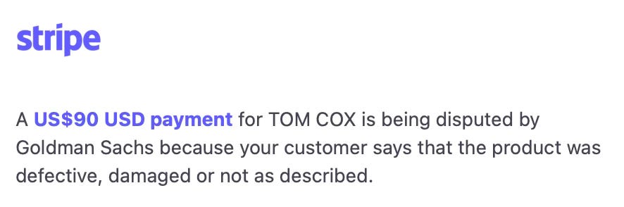When my paying Substack subscribers’ subscriptions autorenewed, some of them began to contact their bank and flag the payment as fraud. This meant that I received an email from Stripe, each time, saying that someone had initiated a payment dispute against me. What this means is that the subscription fee is refunded to the subscriber by Stripe, with me footing the bill for all of it (i.e. not just for the portion of it that I received, but the percentage that was paid to Stripe and the platform I was using). On top of this, the writer incurs a startlingly large penalty fee. If the writer chooses to counter the dispute and loses (and, as I found out early on, the writer always loses these disputes) they receive another penalty fee on top of that. It’s a hugely expensive process.