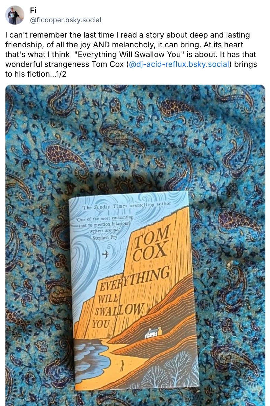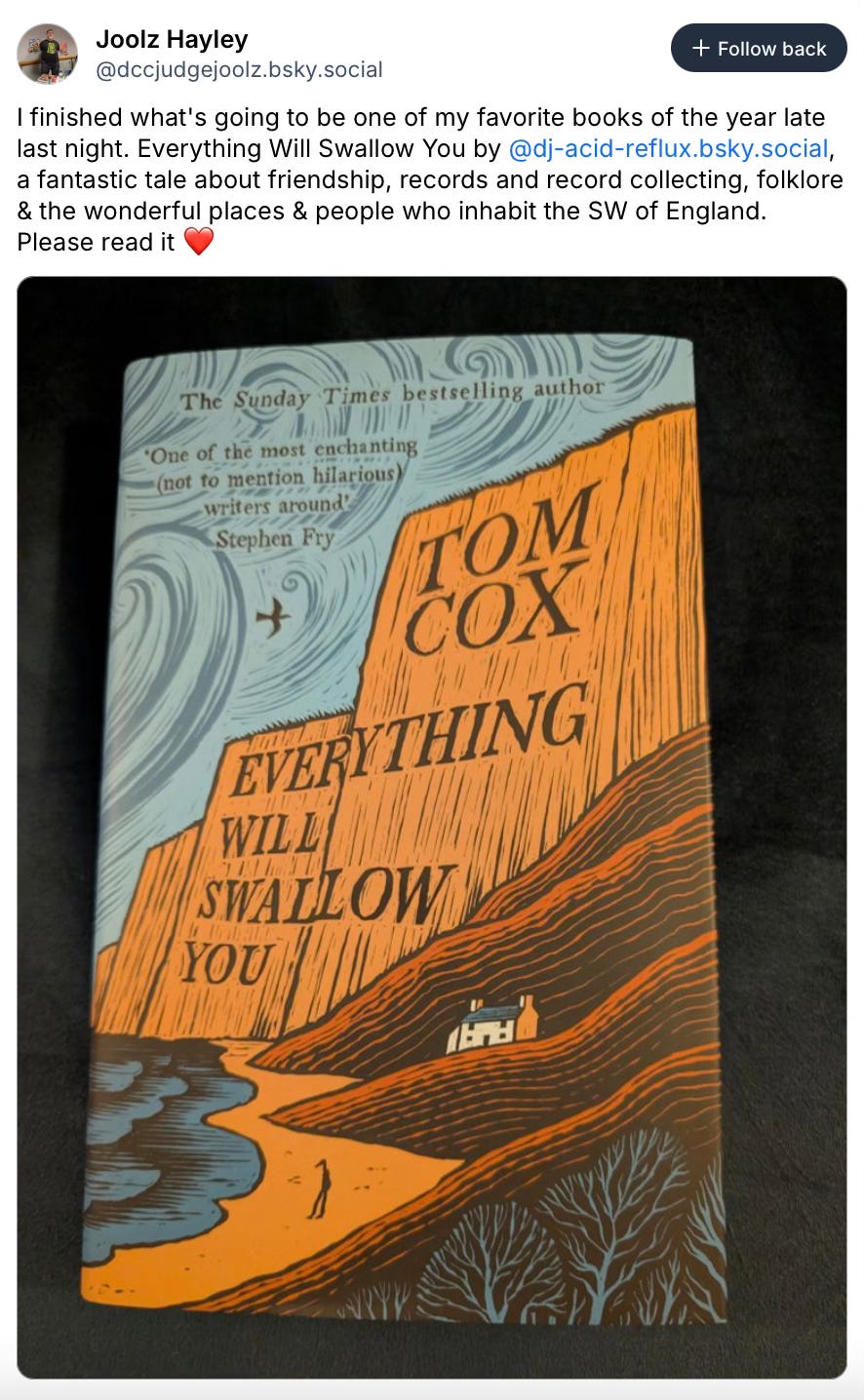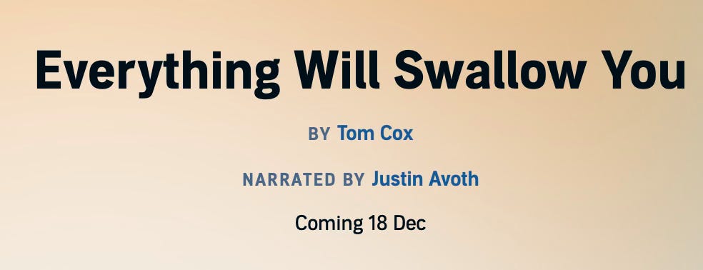 Because of the disaster I wrote about here, I’m aware that a lot of people don’t know I had a new book out in September. It’s called Everything Will Swallow You and you can read extracts of it here and here.